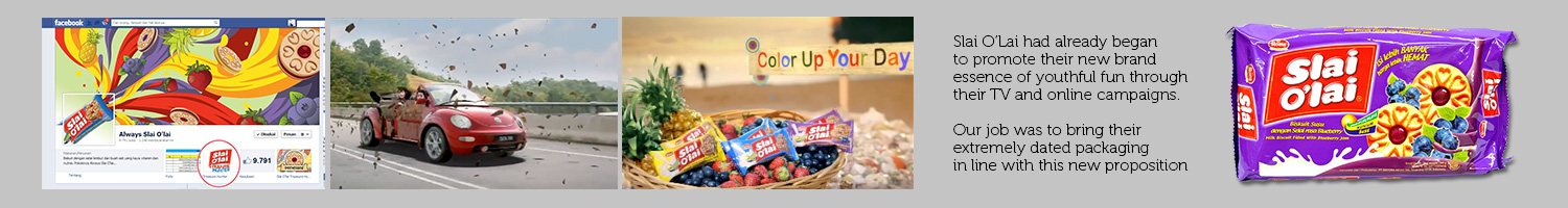 Slai O’Lai belonged to the premium segment of biscuits for Mayora. Its previous stature didn’t give justice to its premium price point or its vision to be a vibrant, youthful and a progressive lifestyle brand. Our task was to bring these values to the forefront of the work and help the brand fit with their campaign ‘color up your day’.